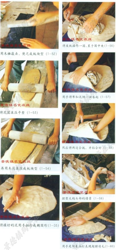 如图所示,用一块湿布蒙在泥面上,用木棰敲击,使之成板块型。用木质滚筒在泥面上前后来回滚压,使之成板块型。先将泥用前面两种方法之一制成厚泥板,然后用细钢丝按一定的厚度平行切割泥板,使之成板块型。(1-52~54)