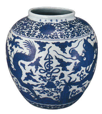 | 明清期间,青花瓷器的主产地集中于江西景德镇。由该镇产出的青花瓷制品,品类花色众多,质料上乘。从外观上看,其大多数产品型制作工规整,轮廓自然舒展,装饰图案线条流畅而富于变化。当中特别要以那些贡品官窑(明代称“御器厂”,清代称“御窑厂”)器和部分“官搭民烧”器为其代表。此类瓷作皆为瓷中精品。这些精品瓷作,首先在制胎、拉坯及修坯方面,操作流程要求极其严格,工艺十分考究。因此成品瓷,胎土匀净,胎质洁白坚密。而在器表图案装饰方面,更是一展两朝画师之所长,他们对瓷胎上的画作进行缜密地推敲,并予以合理布局。 随着时代的变迁,两朝画师所用青花颜料(氧化钴)在不同阶段也不尽相同。既有采用明代早中期从阿拉伯(伊拉克)等地区购进的进口“苏麻尼青”料;也有明中期以后取自国内新疆的“回青”料、浙江的“浙青”、江西的“平等青”和云南的“珠明料";还有明至清代民窑最常用的江西“石子青"等青料。国产青料的使用,早在明代早中期民窑青花瓷图案中就有所反映。如明成化年的“青花夔龙纹盖罐”,既是明中期典型的民窑器,所用青料就是国产“石子青”,其发色蓝中带灰。而此时官窑器的青料仍以进口料为主。到明成化年后期,由于进口“苏麻尼青”料的严重匮乏以至枯竭,官窑器上的图案也必须以国产青料来作画。成化晚期的官窑器,基本上采用的是呈色淡雅清亮产自江西的“平等青”。为能达到青料发色的完满,瓷艺匠师们,只能在原有民窑国产青料的使用基础上加大研发力度。他们经过在画作中的长期实践,创造性地用国产钴料研配出各种不同色阶,因而得到了迅速地推广及运用,最终摆脱了进口青料在青花产业上的局限。 “苏麻尼青”料与优质国产料的相继应用,使画师们能更充分地运用其手中的丹青妙笔,在作画时挥洒自如,尽情地采用勾、描、填、涂、抹、皴等行笔技法。凡在瓷胎上绘制花鸟鱼虫、山涧溪流、海浪祥云、怪石芭蕉、草木瓜果或是楼台水榭、神仙佛道、飞凤游龙、瑞兽八宝、刀马人物以及人物故事、玩婴嬉戏等诸多的装饰图案,均能展示出他们高超而深厚的艺术功力。 明早期永乐、宣德年的官窑瓷器,纹饰题材日趋丰富,以动植物图案为主要装饰,作画用进口“苏麻尼青”料。如“青花花果带盖梅瓶”,为明永乐官窑传世品。通高41.2厘米、口径5.5厘米、底径12.2厘米。瓶设钟式宝珠纽盖、溜肩鼓腹,腹上提、胫内敛。器表青花图案发色浓艳,大小不均深陷胎骨中的黑褐色斑点,不规则地散布于略带晕散的花果叶蔓之中。盖面绘缠枝莲与折枝海棠纹,肩部勾画变形覆莲瓣纹。主题纹饰或以双勾填色或以平涂勾边的写实技法,将叶蔓、花朵、石榴、枇杷和桑椹等花果描绘的鲜嫩欲滴,香气四溢。而胫部则以平涂勾边,细描叶脉纹来绘制重叠上仰的蕉叶纹一周,该纹象征环抱托起之寓意,使梅瓶挺拔而显稳重。 “青花海水白龙纹扁瓶”,明宣德官窑传世品。通高47.4厘米、口径8.1厘米、底径15.7厘米。直口、束颈、溜肩、圆扁腹。颈部饰青花缠枝牡丹花纹,以单勾平涂技法绘成,颈下肩部书横向“大明宣德年制”楷书款。器腹满饰勾边露白青花海水波涛,使蓝白相间的波涛翻腾汹涌、层次分明。青花发色浓艳深蓝,亦有小颗粒黑褐色晶斑散布于图案之间。主题纹为一条穿波戏浪回首观望的白龙,白龙轻舒利爪,回首开口,舞动劲键的躯体,搏浪前行,神态威猛,极富动感。 “青花一束莲纹折沿盘”,明宣德的传世品。高7.9厘米、口径44.8厘米、底径29厘米。折沿、弧壁、深腹、圈足。沿面绘青花海涛浪花纹,海涛以单线细描,浪花双勾露白。这种蓝白互用的表现手法,尽显浪涛汹涌澎湃之立体感。内壁平涂勾边,饰一周青花缠枝莲纹,莲花绽放、叶蔓繁茂。盘内心主题纹为青花一束莲。朵花、叶蔓分别以双勾填色、一笔点画绘制而成。青花呈色浓艳,图案运笔细腻流畅。 进入明中期后,纹饰发展趋于多样化,除动植物纹外,人物和景物装饰图案也较常见。此时的官窑器,最善用由“回青与石子青”配制而成的国产混合青料,“佛头青”是此时最上乘的青料,其发色深蓝泛紫,清亮艳丽。“青花云龙纹罐”,明嘉靖官窑传世品。通高52.8厘米、口径24.7厘米、底径30厘米。直口圆唇、溜肩、鼓腹,平底略凹。颈之间书“大明嘉靖年制”横向楷书款。肩部巧用勾边填色技法,饰以青花缠枝莲纹。腹部主题纹,亦以勾边填色之法绘制出青花双龙庆寿图。双龙腾空飞舞,张口瞪目,首尾相随,龙首与龙尾之间草书一“寿”字。整体纹饰布局繁满,龙文虽矫健生动,但图案线条较前朝龙纹比照仍觉力度欠缺。 “青花人物龙凤纹盘”,明万历官窑传世品,足底书“大明万历年制”楷书款。高5.5厘米、口径32厘米。撇口、弧壁、浅腹、圈足。内壁饰青花双龙凤火珠云气纹,青花主题神仙人物纹绘于盘心。主题人物纹与辅助龙凤纹,皆以勾边填色绘画而成。人物清瘦高古,衣无折皱,眉目迷蒙,给人某种神秘之感。龙凤纹体态修长,飞舞飘逸。 我国青花瓷器的图案装饰工艺,经历了漫长的发展过程,至清代时已经完全成熟。此时官窑和民窑器的图案题材不仅广泛,而且绘画更为精湛。清康、雍、乾三代,是青花瓷发展中的又一鼎盛时期。“康乾盛世”,为了满足皇族的需求和高档瓷的外销,御器厂开始实施“官搭民烧”制度,至此形成