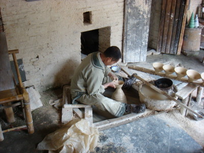 坯做好后是栽坯,做坯工将做好的坯从辘轳车上取下来,放在料板上,这一过程又要讲究坐低脉门撮督子,其高低不能超过两指。这样,一只水作坯就在一坨泥巴上微妙变化着,在做坯工的手中神奇出现了,这种原始手工拉坯在瓷到延续了千百年。