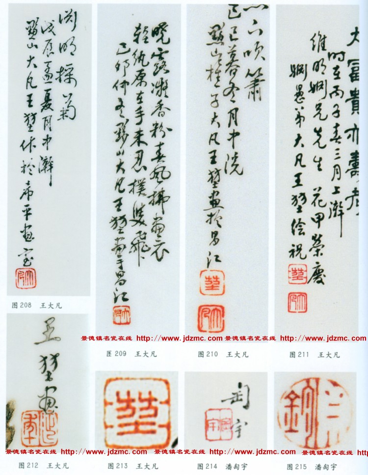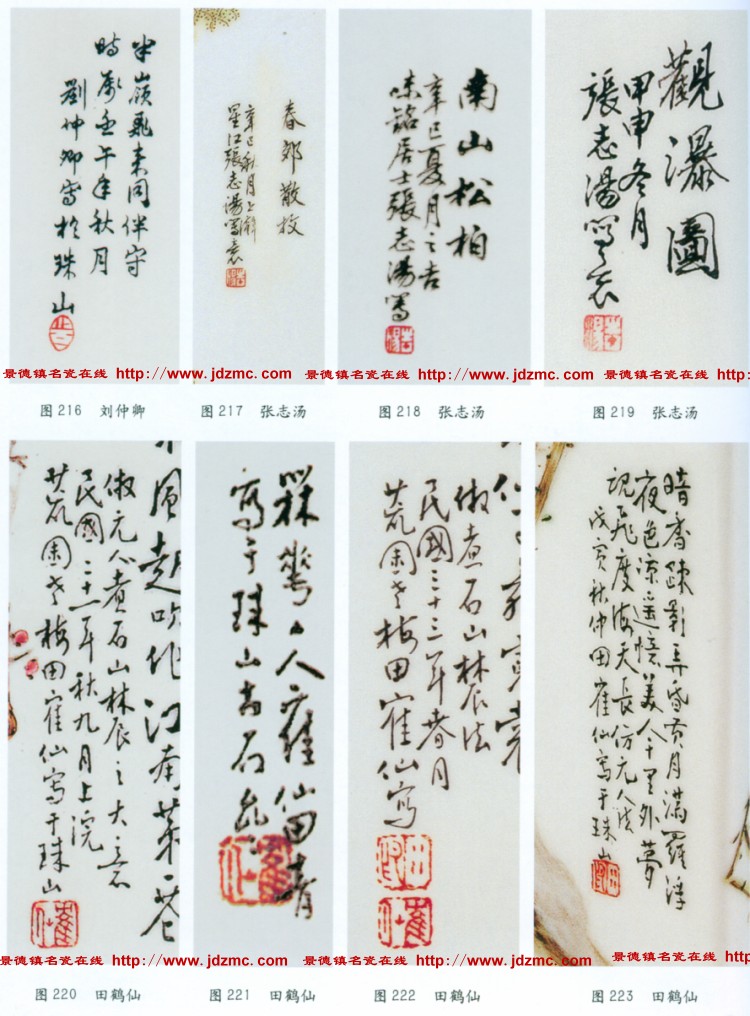 王大凡(1886-1961年)款识以“黟山大凡王堃作于希平草庐(画室)”、“黟山樵子王大凡写于昌江之希平草庐”较为常见,另见有“黟山王大凡画”、“希平居士昌江客次”等。印章款有红彩“大凡”、“王堃”等篆款。 图207为王大凡人物图瓷板印章,印文为“大凡”。 图208为王大凡粉彩人物图瓷板款识,文为“黟山大凡王堃作于希平画室”及红彩朱文“大凡”印章一方。 图209为王大凡人物图瓷板款识,文为“黟山大凡王堃画于昌江”。 图210为王大凡人物图瓷板款识,文为“黟山樵子大凡王堃画于昌江”。 图211为王大凡人物图瓷板款识,文为“大凡王堃绘祝”。 图212为王大凡印章款“堃”字。 图213为王大凡粉彩松芝图瓷板题款,文为“王堃画”及红彩方章一枚。 潘匐宇(18877-1926年) 款识以“古欢斋主甸宇画”及“甸宇”常见。 图214为潘甸宇浅绛彩鹦鹉图瓷板款识,画面右上角仅“甸宇”二字及红彩“甸宇”方章一枚。款字红少白多,极为醒目,线条纤细而流畅。 图215为潘甸宇人物图瓷板印章款识,文为“鼎钧”。书法拙朴,甚有古意。 刘仲卿(1889-1969年)南昌瓷器彩绘名家。 图216为刘仲卿1942年粉彩花鸟图瓷板款识,文为“时属壬午年秋月,刘仲卿写于珠山”,及红彩“之印”椭圆形章一枚。书法流畅,转折之处多有顿按。 张志汤(1893-1971年)是与八友同时成名的景德镇彩瓷名家。 图217为张志汤1941年粉彩舂郊散牧图瓷板款识,文为“星江张志汤写意”及红彩白文“志汤”篆书方章一枚,笔力雄健。 图218为张志汤1941年粉彩南山松柏图瓷板款识,文为“辛巳夏月之吉,味铭居士张志汤写”及红彩白文“志汤”方章一枚,书法较上款娟秀。 图219为张志汤观瀑图瓷板款识,文为“甲甲冬月,张志汤写意”。 田鹤仙(1894-1952年)题款多有古越字样。常用印有“萑仙”、“田印”。 图220为田鹤仙粉彩梅树图瓷板款识,文为“荒园老梅田萑仙写于珠山”及红彩朱文“萑仙”篆书方章一枚。方章中的“仙”字单人旁顶天立地,“山”字小而居下边,但题款中的墨书“山”字在红彩方章之中,故印文极为和谐,由此可知作者在谋篇布局上的新意。 图22l为田鹤仙粉彩梅树图瓷板款识,文为“梅花主人宦仙田青写于珠山古石斋”。田氏作品中此类题款不及前者多见。田氏作品中亦见有“宦仙田青写于珠山”类不加别号的款识。 图222为田鹤仙粉彩梅花图瓷板款识,“荒园老梅田宦仙写”。 图223为田鹤仙粉彩梅花图笔筒款识,“戍寅秋仲,田萑仙写于珠山”。 程意亭(1895-1948年) 款识以“翥山程意亭”、“翥山樵子程意亭”最为常见,印章有“程印”、“程氏”、“意亭”等。 图224为程意亭富贵白头图瓷板款识,文为“翥山程意亭写于珠山佛印湖畔”。 图225为程意亭花鸟图瓷板款识,文为“意亭程甫之笔”及红彩方章二枚,印文分别为“意亭”、“程”。 图226为程意亭粉彩花鸟图瓷板款识,文为“翥山樵子程意亭写于佩古斋”及红彩白文“程印”,朱白相半“意亭”方章二枚。此款内容全面,有号、名及斋名。 图227为程意亭粉彩花鸟图瓷板款识,文为“翥山樵子程意亭写”及红彩白文“程印”、“意亭”方章二枚,用笔极为流畅,顿按有力。 图228为程意亭粉彩孔雀图瓷板款识,款文仅“意亭写”三字及红彩白文“程印”方章一枚,款文用笔精工,印文线条粗犷而流畅,程氏此类款识较为少见。 王步(1896-1968年)署款见有“王步”、“丰城长湖主人”、“竹溪道人”等,亦有许多作品无款,常用印文有“王步”、“竹溪”、“长湖”等。 图229为王步雄鹰图瓷板款识,文为“王步戏作”。 图230为王步1945年粉彩无量寿佛图瓷板款识,文为“剑城长湖竹溪道人王步写意”及红彩朱文“竹溪”、“王步”图章二枚。书为行草,风格豪迈洒脱。王步为丰城长湖竹溪人,故作品多有“长湖”、“竹溪”款识。