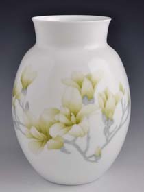 中国工艺美术大师陈扬龙,独创出了一套薄施淡染分层加色画法。这一画法源于传统又超越传统,极大地丰富发展了釉下五彩的技法,极大地拓展了醴陵釉下五彩瓷绘画艺术空间。用此法创作的作品晶莹润泽,清新明快,另有一番韵味。拿他创作的牡丹《国色天香》来说,以写实的手法与装饰性构图相结合,在传统釉下彩绘平填收水法表现画面阴暗的基础上,运用薄施多层渲染等方法,丰富和增强画面的主体感和层次感。微倾的花姿吐露纯净秀美;花下树叶,聚散有致,饱满中显空灵,让人感觉淡雅中春意盎然,确有“国色天香”般的风韵。
