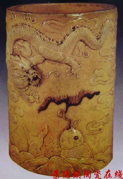 | 王炳荣 黄釉堆花鱼龙纹笔筒 清光绪 | |||||