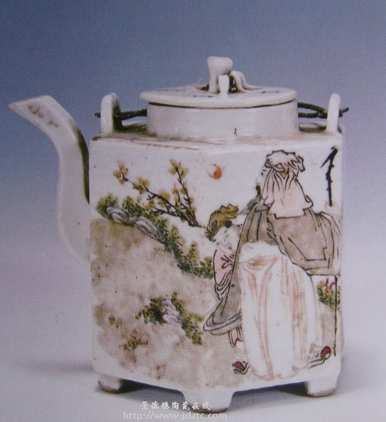 达和《出游图》浅降彩方提梁壶 白文宏藏 |
