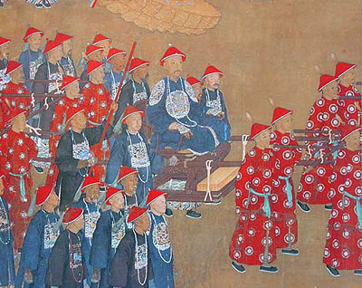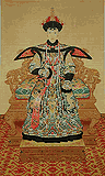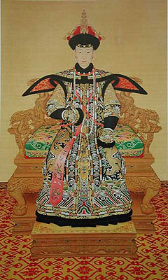 1、 皇帝像。 清朝自入关定鼎中原后,共有十一代皇帝,除去末代宣统皇帝溥仪,赶上了照相机的时代,留下有照片外,其余所有的皇帝都有画像存世。这些皇帝的肖像画中,大都是人物穿戴整齐的"朝服像",此外还有不少的"便装像"(图一)和"古装像";皇帝的肖像一般都是一个人独幅的,也有巨幅作品中皇帝和其他人在一起的群像。清朝皇帝中最高寿的乾隆皇帝,留下的画像也最多。 2、 皇子公主像。 皇帝子女的肖像,一般附着于表现皇帝家庭生活的"行乐图"(图二)中,如在《乾隆雪景行乐图》(藏北京故宫博物院)(图三)上,就可以看到乾隆皇帝众多的子女形象。 3、 后妃像。 清朝历代后妃差不多均有画像存世(图四),甚至还有若干油画像。郎世宁所画的《乾隆皇帝及后妃像》卷(藏美国华盛顿弗利尔美术馆)中,描绘了乾隆皇帝以及后妃们的肖像。 4、 文武功臣像。 这部分画像以"紫光阁功臣像"为主,描绘了历次征战中立功将士的相貌。 5、 太监内官像。 在表现皇帝及后妃像时,有的地方也会看到侍奉帝后的内官和太监的形象,这是个特殊的人群。 (二) 记录事件经过。 记录事件经过的作品,大致有描绘出巡、战争、祭祀、筵宴、典礼等事件的图画。这些作品一般都场面宏大,人物众多,环境真实,具有"实录"的价值(图五——图八)。