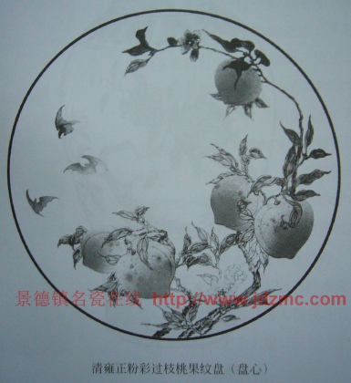 四季瓜果纹 四季瓜果纹是指以各种植物果实为主题的纹饰。历代装饰手法中有模印、贴塑、雕刻、彩绘等。瓜果纹最早出现于唐代。唐宋两代陶器上多见葡萄纹和石榴纹、有缠枝葡萄、婴戏葡萄、婴戏石榴等图纹,均含多子多孙的寓意。如宋代耀州窑青釉盘:盘内刻划石榴树上儿童嬉戏的图案。元代青花瓷器上常以瓜果纹组成秋实画面。如青花大盘上多绘葡萄、西瓜、芭蕉、花草组成的果实图案。明清两代瓷器装饰上瓜果纹样增多,如石榴、荔枝、葡萄、枇杷、桃、西瓜、苹果、樱花等纹样,并在吉祥观念的影响下,形成丰富多彩的吉祥图案。装饰有图案性和写实性两类,构图形式多样。如明永乐青花瓜果花卉大盘盘心,以果实纹饰为主体,配以花卉和水浪为边饰,构图严谨丰满;成化斗彩葡萄纹杯,以单独纹样形式装饰;宣德青花梅瓶和玉壶春瓶则采用散点布局的形式绘上桃枝、石榴、荔枝、枇杷、苹果等纹样。而在釉里红高足杯上,绘等距环布的三只桃或其他瓜果,采用的是均齐式布局。清代吉祥纹饰盛行,瓜果纹寓意更丰。康熙釉里红桃蝠纹瓶,雍正青花桃蝠纹瓶,都描绘桃树结硕果、蝙蝠天上飞的纹样,以桃喻寿,以蝠喻福,祝贺福寿双全,如清光绪粉彩福寿双全纹盘。乾隆黄地青花瓶上以佛手、桃、石榴三果组成寓多福、多寿、多子的画面,也称“福寿三多”纹。