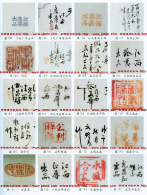 广华居出品 产品以帽筒最为常见,质量一般,绘工较好。图148为粉彩富贵寿考图帽筒底款,青花楷书“江西广华出品”。图149为该器物外壁题款,墨书“江西广华居出品”。 慕昌出品 从产品风格看,不晚于20世纪20年代,产品以帽筒较为常见,质量较好。图150为粉彩人物图帽筒底款,红彩楷书“江西慕昌出品”。图15l为该器物外壁题款,墨书“慕昌出品,珠山客邸”。 汪利记出品 产品以日常陈设瓷为主,多见粉彩仕女人物图帽筒,质量一般。 图152为粉彩八仙人物图帽筒底款,红彩白文“利记”篆书。图153为该器物外壁题款,墨书“江西汪利记出品”。 益记出品 生产年代约20世纪20年代,产品多为日常生活用瓷,质量较差。 图154为粉彩婴戏图提梁壶题款,墨书“仿六如山人法,辛酉之夏,益记出品”。 铨发出品 产品以日常生活用品为主,质量一般。图155为粉彩仕女婴戏图提梁壶题款,墨书“江西铨发出品”。 协昌祥出品 生产年代约在20世纪20年代,产品以日常生活用瓷为主,质量较好。 图156为粉彩仕女图提梁壶题款,墨书“乙丑年之冬月,江西协昌祥作”。 图157为粉彩陶渊明爱菊图茶盘款识,墨书“江西协昌祥出品”行款,较上款略工整。 裕美华 产品以日常生活用瓷为主,质量一般。图158为粉彩携琴访友图提梁壶题款,墨书“江西裕美华作”。 荣义成造 产品以日常生活用瓷为主,质量较好。图159为金彩团凤纹提梁壶底款,红彩双框内“荣义成造”篆书。 顺和祥 产品以日常生活用瓷为主,质量一般。图160为粉彩庭院仕女图提梁壶题款,墨书“仿六如之法,顺和祥作”。 公利祥造 产品以帽筒最为常见,色彩大红大绿。图16l为粉彩三果纹帽筒底款,红彩方框内“公利祥造”四字楷体。 义顺太造 生产年代约在民国初,产品以日常生活用瓷为主,质量一般。 图162为粉彩婴戏图执壶题款,墨书“戊午秋月义顺太作”,为1918年产品。 顺泰合记 生产年代在民国初,产品以日常生活用瓷为主,质量一般。 图163为粉彩婴戏博古图执壶底款,红彩方框内“顺泰合记”楷体。外壁题有“辛亥之秋月客次顺太合作”款识,为1911年产品。 余森茂号 产品水平较高。图164为粉彩螭龙纹瓶外足墙款识,红彩椭圆形单圈内篆书“余森茂”。此种书款方式较为少见。另见有浅绛彩器物,底为“江西余森茂号”楷款,外壁为墨书“江西余子贞出品”。 图165为粉彩人物图茶盘盘心款识,墨书“江西正厚出品”,书法一般。 永盛和记 见有粉彩日用瓷,制作较为精良,从风格看,不晚于1930年。图166为粉彩人物图盘底款,红彩双框“永盛合记”印章款。 允昌和出品 见有粉彩茶具,从作品风格看,不晚于1930年。 图167为粉彩山水人物图茶盘盘心款识,墨书“江西珠山允昌和出品”行楷。