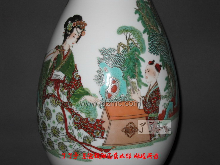 在景德镇这赣北的繁华小城里,每一家对子女的教育都是非常在意的,在景德镇到处都是琴院,棋院,书院,画院,和跆拳道馆,遍洒着孩子们上学堂的风景。普天下牵挂的心是一样的,有一件作品映入视线,值得您全神端视的当代古彩作品-“课子图”,作者是方复教授。此作品,以母亲教导孩子读书为主题,母亲面容端庄神情专注,孩子在母亲指导下朗读诗文。一座仿古书台至于画面中间,花草竹阴,石树丛丛,充分展现书香世家之母子亲情。