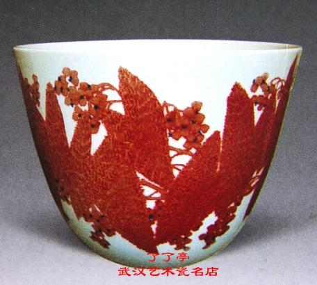 明清以来,海棠因其谐音而有富贵满堂的吉祥寓意。这件作品全用釉里红装饰,从整体上看,红白相间,点、线、面组成热烈的交响,细看肌理丰富,丽人寻味。作品另一个特点是具有环视效果,装饰与造型组合非常紧,枞每一个角度看都有欣蒉价值。这本是二方连续的特点,作品吸取了这一形式中的某些因素,加以变化,每个角度都可以说是主要面,随意一摆都好看。 |