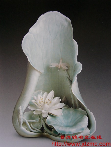 荷叶扇形卷立,罩影青釉,荷花绽放,清香扑鼻;蜻蜓栖于莲蓬之上,轻盈优美;几款小荷叶,生机盎然,有“小荷才露尖尖角,早有蜻蜓立上头”的失境。整个作品制作精细,风格典雅清丽。 |