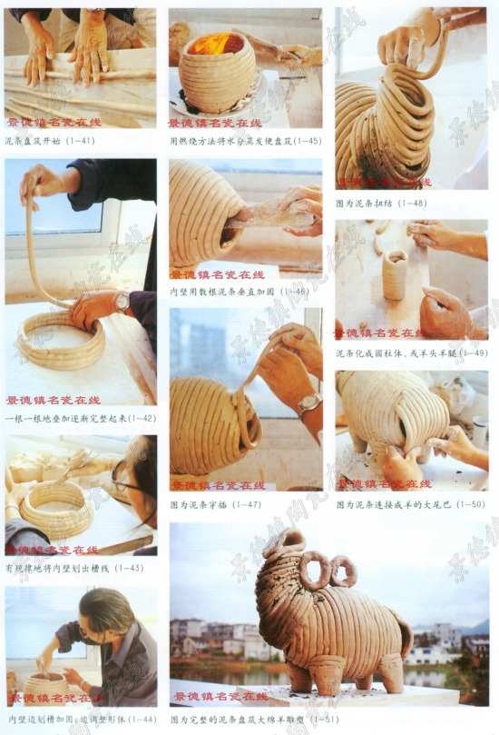 注意事项 为使泥条快速干硬,可借助燃烧方法使之水分蒸发,以便继续盘筑。球体内壁用数根泥条垂直加固,以防烧成后坍塌变型。盘筑工艺不能满足整齐划一的线条排列,要讲究线条的对比变化,如粗细、长短、疏密、虚实、穿插、扭结从而产生节奏感。为泥条穿插、扭结。有的线条可以淡化,形成块面,也可以泥板泥条相对比,互为映衬,为羊的腿,泥条淡化成圆柱体,羊的头泥板。