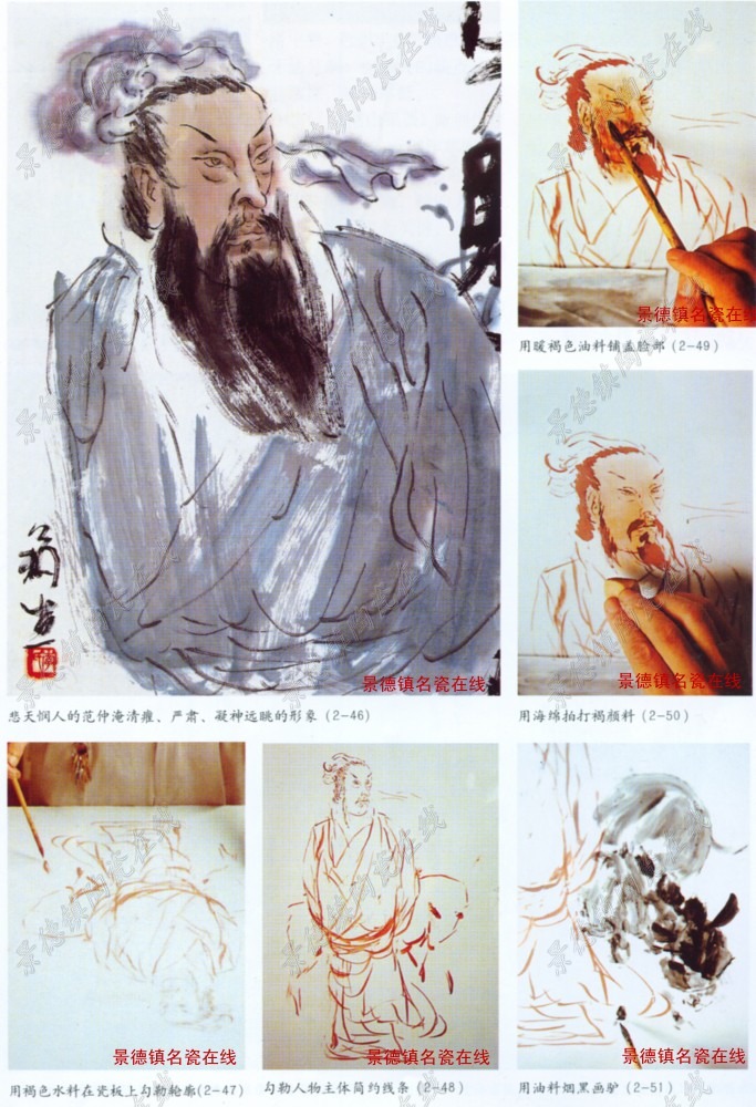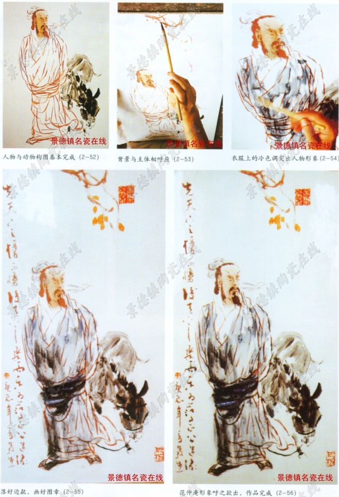 瓷板起稿纸上起稿后,用褐色胶水料在瓷板上勾勒出人物与动物的大体轮廓,人物形象稍有变形夸张,注意布局的整体气势,运笔随意挥毫,闪为有不当之处可随时擦抹掉。