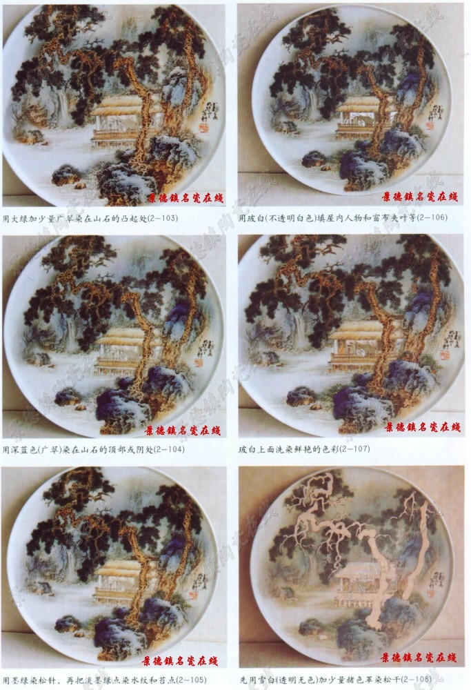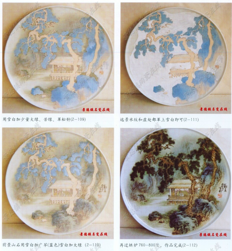 前景山石用接色的方法,参照底色的部位,用雪白加广翠(蓝色)雪白加大绿,雪白加赭色,和纯雪白进行接色罩染。