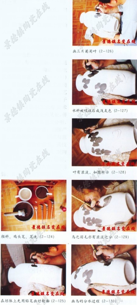 《葡萄小鸟》图,三片葡萄叶;画面的水料已被坯体吸收,故灰白,后面水料未被吸干,故色深;叶有浓淡;鸟之羽毛,与葡萄叶手法相仿,亦有浓淡之分。