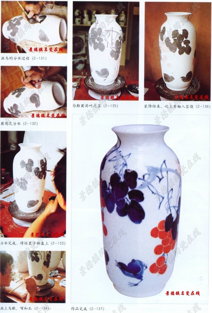 画上鸟之眼、嘴和爪,用浓淡不一的青花料,画出葡萄藤。装饰结束,以待吹上青釉入窑锻烧。