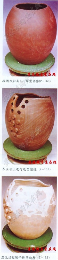 拉坯:在拉制陶艺坯体之前,预先要构思绘制奸图稿,便于确定所作陶艺能否成型,在烧成中能否达到设计意图,要尽量避免在成型或烧成中容易下沉、变形、开裂等失败因素。因此,可先按图纸拉成1:1大小的雏型坯体。