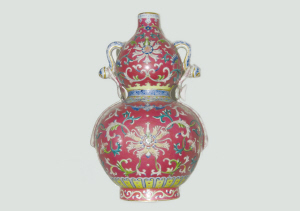 此瓶两耳为如意型,下配穗子。葫芦瓶是南宋后期龙泉窑创制的瓶式,瓶体似葫芦,故名。小口,短颈,瓶体由两截粘合而成。名与“福禄”谐音,且器形像“吉”字,故又名“大吉瓶”,寓意大吉大利。明清两代,葫芦瓶大量烧造,器形也有较多变化,品种有青花、五彩以及蓝釉等。
