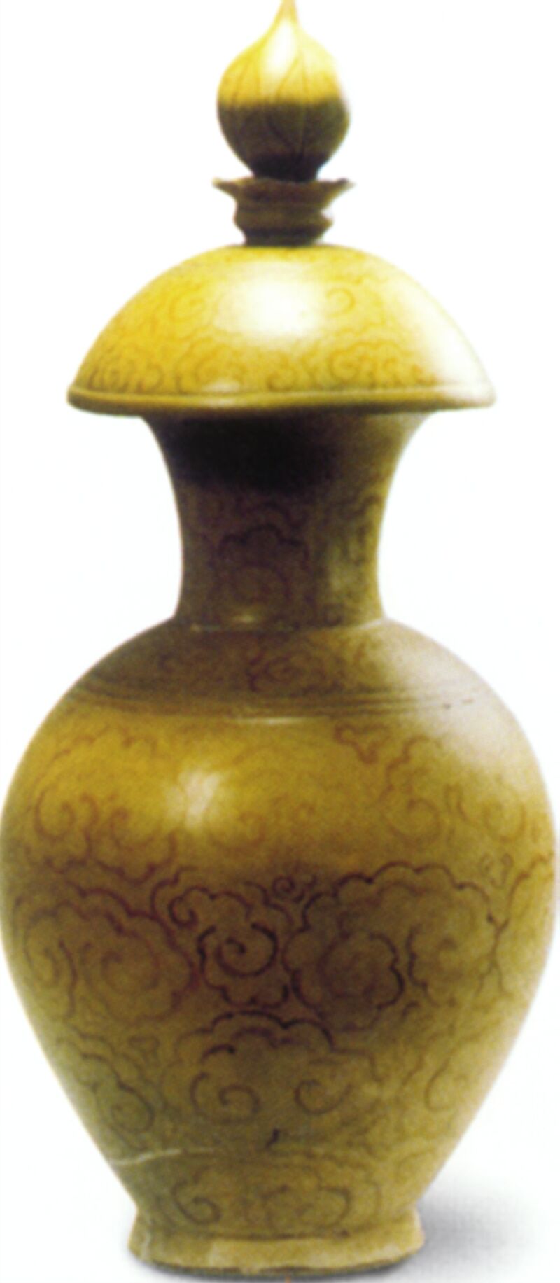 此罂通体施青釉,青中泛黄。釉下为褐彩绘出的如意头形卷云纹。釉色与纹样搭配非常协调。