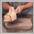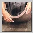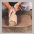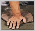 先在陶土下垫一块布,用手掌将粘土丘扁。然后在粘土的两端各放置一和所需泥板厚度等厚的木条,用摊面棍前后滚压,直至压到和木条厚度相同为止。适于制作较大面积的泥板。 | |