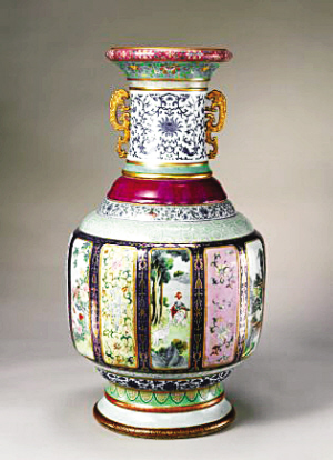 清代乾隆时期的景德镇御窑厂,在乾隆皇帝好古追奇的驱使下,聚集了一大批能工巧匠,再加上督陶官唐英的苦心经营,各种新奇灵巧的制品层出不穷。这件素有“瓷母”美称的各种釉彩大瓶,体现了当时制瓷工艺的登峰造极,传世仅此一件。