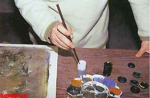 用新彩来装饰陶瓷壁画,首先要用胶水调成的料勾线,而后还要用它彩出画面的深浅,明暗来,再用新彩颜色调出自己所需的色料。上色时能一次完成,不能重复,最后就是烤烧,如烤烧出来后色彩和明暗都没有达到预想的效果,可加色再烧第二次,二次没达到,还可以加色继续烧,这是新彩的优点,古彩、粉彩就不能多烧。