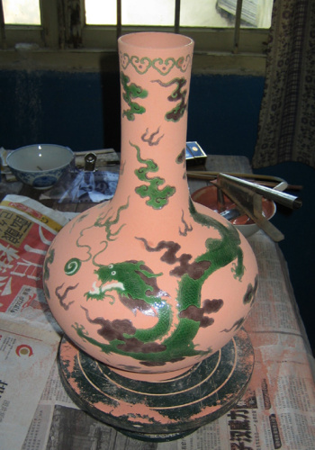 以仿制元青花为例,在今天已经没有当年进口钴料、只能采用低铁高锰的珠明料的情况下,高仿艺人首先需要在颜料中添加一些含铁的矿物质以造成明显的铁锈斑效果,并且还要保证最终的青花发色到位,这并非易事。其次,在一些需要造成钴料晕散流淌效果的位置,往往通过在绘制的过程中采用局部加重颜料,或是吹釉时厚薄有所区分的方法,等等。 烧制前常温状态下的釉往往呈现出与烧成后截然不同的色彩,那些白色的釉就可能会是用于青花等釉下彩瓷的透明釉,而看上去呈粉红色的釉则有可能是青釉。釉对瓷器最终呈色效果的影响极大。仍以青花瓷器举例,钴料如若失去透明釉的保护,烧成后就是黑色而非蓝色(康熙朝的粉彩和五彩等釉上彩瓷开始采用在釉上绘钴料造黑色效果的方法);而透明釉如果施薄了,很可能这件青花的发色就会发乌“发枯”(即釉面不滋润),碰到这种情况,艺人往往选择重新施釉后“复火”的方法以达到更佳效果;若透明釉施厚了,则又会让钴料晕散流淌,或出现“朦花”(笔者注:指釉下的青花纹饰不能清晰显现,仿佛在雪里一般)。由此可见,施釉水平的高低对于一件仿古瓷最终能否成功呈色是非常重要的。 几件发色不理想的青花瓷,重新施釉后等待“复火”