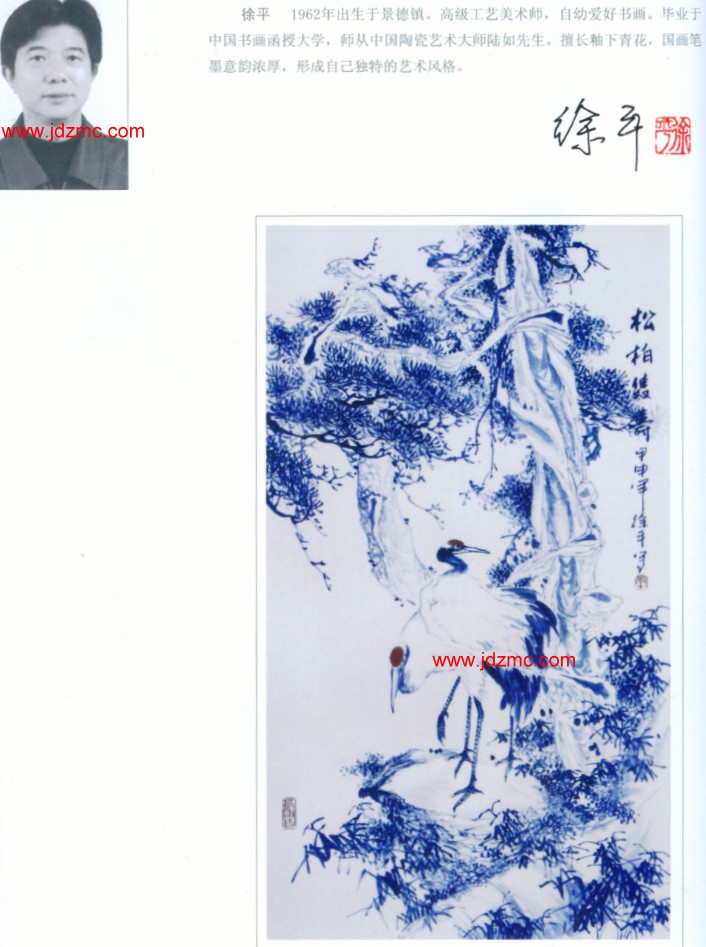 徐平 1962年出生于景德镇。高级工艺美术师, 自幼爱好书画。毕业于中国书画函授大学,师从中国陶瓷艺术大师陆如先生。擅长釉下青花,国画笔墨意韵浓厚,形成自己独特的艺术风格。