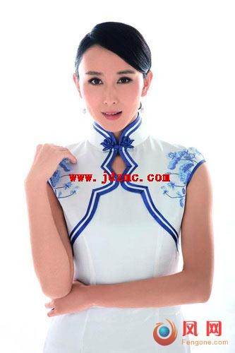 胡静的白绸青花旗袍,开一时风气。 清韵时光流曳,岁月浮沉,千古不变的是她的绝美。温润的白色、雅致的青花…… 青花瓷最大的特点,在于其脱俗的清韵。当她与旗袍相遇,那么最美不过衣襟上的一领青花绣。不需要更多的缀饰,这是留白的艺术。 胡静的这款白绸青花旗袍,将温润的肤色、细腻的白绸以及青花绣结合起来,充分展现了东方女子的清韵。