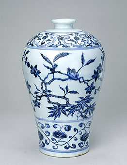 明代的梅瓶虽然在装饰上有釉里红、青花、红釉、祭蓝釉、白釉、龙泉釉、仿哥釉等,但是此时的梅瓶造型风格虽然在不同时代有一些变化,但总的风格还是统一的。它们包括1957年江西省江宁宋琥墓出土的明洪武釉里红松竹梅盖梅瓶、明正统青花梅瓶现藏故宫博物院的宣德款青花缠枝花梅瓶、现藏定陵博物馆的明万历青花龙穿花盖梅瓶等。明代梅瓶除了传世品外,有一大批是从墓葬中出土的,这些梅瓶无疑成为鉴定梅瓶的标型器。
