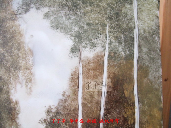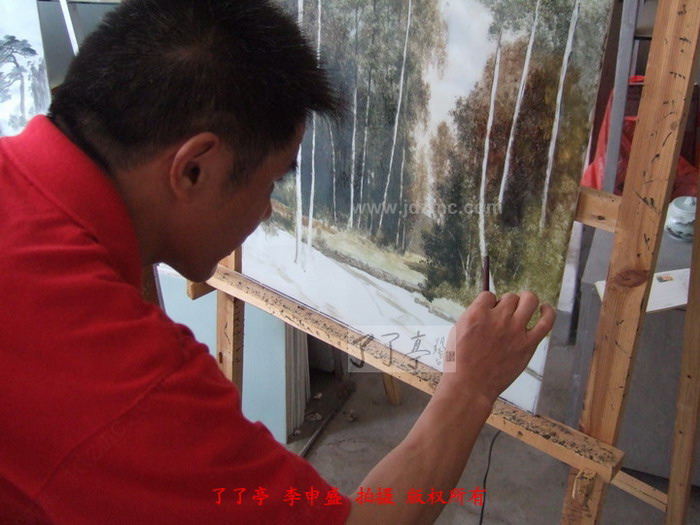 今天在一家小铺门口我突然停留了下来,因为一副油画风格的陶瓷作品吸引了我的目光,我走了进去,看到作者(丁景生-职称:教师·钟莲生学生)正在全神贯注的绘制。具作者告知,这幅瓷板画是用新彩绘制,原型是油画森林大师“希施金”的作品,但是瓷板上只能感觉还原了60%的味道,并不是作者本人没有能力还原,而是作者自己到现在还没有控制住新彩色彩的调和后烧成色调。 就作者说,如果用肖像画的制作方式,新彩是完全能够100%还原油画的风格,但是因为新彩在瓷板上画油画的风格是不能用纯色系的,新彩的色料需要进行调和,而调和后的颜色目前作者还不能完全掌握,前面画的几块瓷板都因为烧窑后的色彩变化太大均告失败,仅侥幸成功了一块。因而作者目前还只是一种摸索的阶段。 笔者和他探讨的时候问询了一个问题:“一个新兴的表现手法固然给人赏心悦目的感觉,但是前面的路能不能走通,即使走通,市场又会如何评价还都是一个未知数,作为探索者可能几年的心血都会白白浪费,不知道您作何感想?”丁景生看了看我,微笑了半天,回了我一句话;“行业里面需要有人先行,我来看看。”然后拿起了笔,继续全神贯注的绘画。了了亭·李申盛/播报