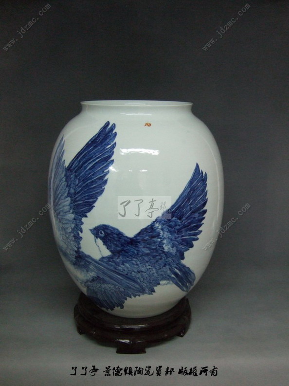 余元是高专的一位老师,教学之余从事陶瓷艺术作品的创作,以青花和颜色釉为装饰手法的创意型作品为主,今天给读者带来的是一件青花作品--“飞翔”,主体造型源于唐宋文人花鸟画中的"绣眼"鸟,经过加工放大处理,形成强烈的视觉冲击力,突显飞翔的含义,各种不同的飞行姿态的布局,是考虑主题与构图的需要,可以在300件大小的环形陶瓷器型上产生独特的视觉效果。 画面中鸟的飞行姿态,表现了自然界中生命的一种追逐。作者的主体图案是第一张图片,有意使鸟儿的翅膀姿略微上倾,加强了一种力度,扎实的绘画基本功使作者能把对事物观察的细心和敏锐准确的再现于他的作品中。因此,单就艺术而言,无论是形象捕捉塑造还是青花绘画形式变化,都是很不错的一件原创型的作品。了了亭·李申盛/文