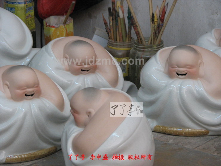 曾经笔者都一度认为哈哈罗汉的仿制现象是刘远长大师同意,或者至少是默许的,因为大量的仿制品,防止作坊就在他的身边,就在他眼皮子底下天天制作出来。这些行径刘远长大师应该是很了解的,而刘远长大师一直都未对这样的现象有过说辞,所以我才误认为刘远长默许了。默许的原因有三,第一刘远长曾经是厂长,会考虑将模具贡献给大家进行制作。第二,许多作坊,甚至许多家庭是靠仿制哈哈罗汉为生的,有大的,有小的,有白纹片的,有青花斗彩的,颜色釉,嗨,等等等等。第三,时间已经过去了十年,(1988年是刘远长哈哈罗汉定型时间,这一点可参考刘远长出品的哈哈罗汉的底部签名处)难受到难过再到习惯应该是刘远长大师对天女散花、哈哈罗汉仿制情况的最好总结。