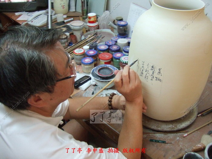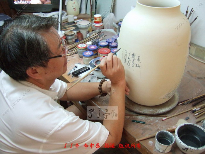 敢画不敢烧,现在是李一新老师矛盾的心理写照,在两次换窑以后,最近几个月烧制作品特别是大件作品屡次出现问题,要么是色彩发懵,要么是釉里红烧挥发,而且到今天为止,这股阴霾还在头顶挥之不去。前一个月从本站登录李一新老师的两个150件作品烧制前后对比文章的同时,李一新老师完成了两个300件作品,每一个300件作品李一新老师要耗时6天左右这六天中间不会画其他的任何作品,然后再画下面一个300件作品的时候中间李一新老师会停顿两天,可是耗时半个月心血的两个300件一个仕女图,一个竹林七贤都陆续因为色彩出现问题而令李一新老师很不满意,特别是后面一个竹林七贤是李一新老师专程为了了亭陈也君女士创新的一件作品,费尽了心力,用李一新老师在dv视频的话中来说,就是作者相当尽心尽力了,但能奈天何。
