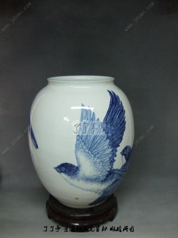 画面中鸟的飞行姿态,表现了自然界中生命的一种追逐。作者的主体图案是第一张图片,有意使鸟儿的翅膀姿略微上倾,加强了一种力度,扎实的绘画基本功使作者能把对事物观察的细心和敏锐准确的再现于他的作品中。因此,单就艺术而言,无论是形象捕捉塑造还是青花绘画形式变化,都是很不错的一件原创型的作品。了了亭·李申盛/文
