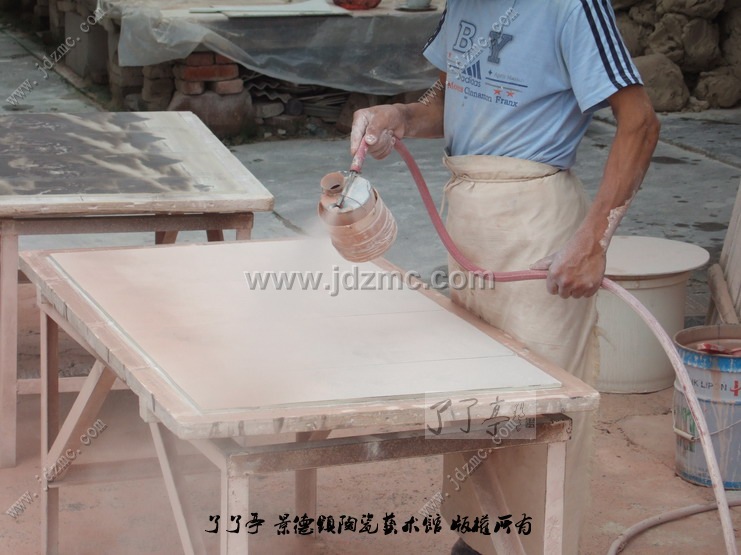 如今古玩能够飞入百姓家,与一些人和机构为了牟取暴利,制作了一批又一批的仿制品有着密切的关系。下面这几张图片,就是刚刚正在吹釉的几块民国八年的青花人物瓷板画。这些东西在市场上四面开花,用铺天盖地来形容一点也不过分。然而,艺术市场上的赝品泛滥,绝不是媒体上的几声吆喝所能够解决的。要想真正从根本上清除赝品,必须由政府有关部门出面,像打击假烟假酒一样重拳出击。可是政府有关部门虽然对珠山八友的仿制品进行过一次清查,那也多是作秀成分太多,事情过后,涛声依旧。其实,古玩仿制品销售情况往往优于当代艺术品,因而利益的驱动使得这个产业形成了一个相当的牢固的链条。