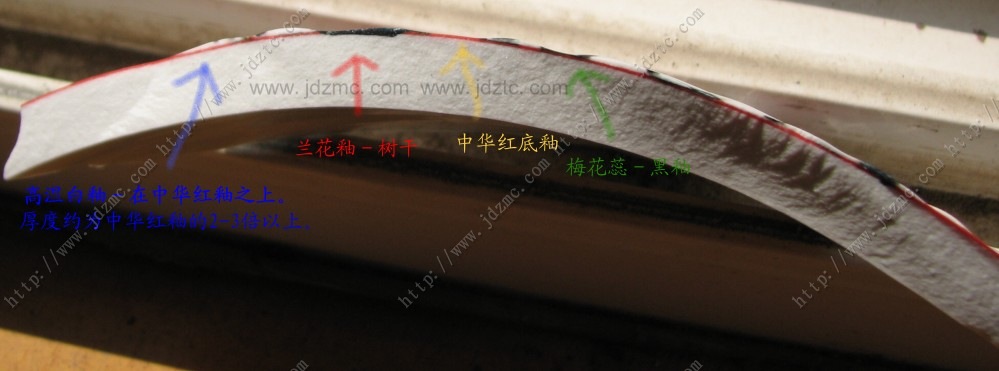 在中华红底釉底基础上分别看到,树干,梅花,梅蕊(枝)等附着在底釉上,我用不同颜色标注出来。 其中兰花釉穿透性的的融入了中华红釉,并更深度侵入瓷土之中。 图/文 了了亭·李申盛