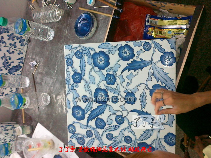 这些图片是釉中彩绘制时的画面,画面中的蓝色是釉中彩的颜料,釉中彩是在瓷器上绘制,再复烧1250摄氏度的一种工艺。有时还会在瓷器上面喷一点薄釉增加亮度。釉中彩在高温下沉降封闭,所以成品没有层次过渡。