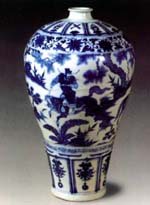 元末景德镇窑制品,高44.1厘米,小口圆唇,丰肩秀腹,浅足滑底的梅瓶造型。1950年出土于江苏江宁将军山明代沐英墓。现藏南京博物馆。梅瓶主饰为“萧何月下追韩信”故事,通体以青花作五层装饰,分别有缠枝花卉纹,仰莲瓣杂宝纹,卷草纹。主饰中萧何催马扬鞭,韩信已至江边正呼舟欲渡。线描流畅,人物形象生动,青花色感幽倩,是元代青花的代表性珍品之一。了了亭·景德镇陶瓷在线 独家专版提供