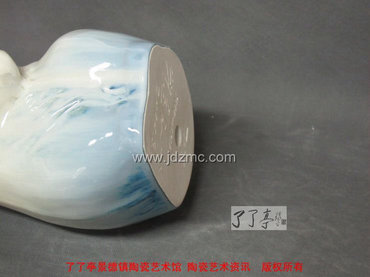 刘远长这只限量1000号兔年生肖陶瓷《玉兔迎春》终于和大家见面了,在色釉的选择上面,刘远长大师拿出了当年经典之作“领头羊”相同的色釉,只是在瓷兔的底部加上了一圈蓝色花釉装饰,这两种色釉都是强流动的高温色釉,也正是这种强烈流动的效果,给予了雕塑动感和皮毛的质感,同时也因为是强烈流动的高温色釉,“玉兔迎春”的底部在烧制的时候是有底托的,在窑火中,高温流动的颜色釉淌过底足,最后进行旋切,这和郎红的烧制方法是一致的,我们可在雕塑的底部看到旋切纹。
