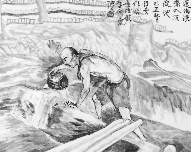 青花瓷板《送淘洗浆入沉淀池》程云作