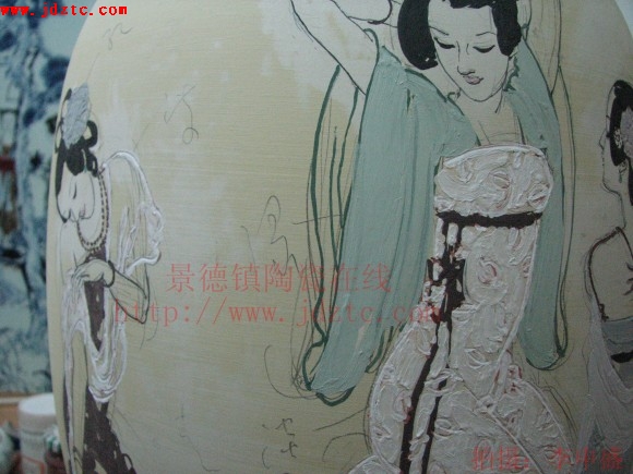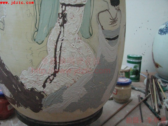 李一新 高温色釉 半成品 本图为高温色釉绘画作品在半成品初始情况,画工基本结束了,喷一层釉就可以入窑了。在入窑前,所有的高温色釉都只是半成品,因为谁都不知道那一把火的最后效果是什么样的!!!