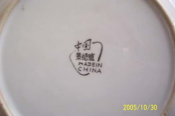 中国景德镇、英文MADE IN CHINA 高白釉描金全白盘的底款,74年 藏友:davis_shen 提供 |