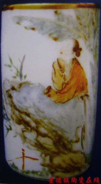 汪友棠 浅降彩仕女图笔筒 清光绪十四年 1888年