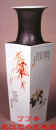 圆撇口,长颈,方肩,平肩微折。瓶体呈四方直简形,是谓"天圆地方"瓶,造型古朴端庄。器身四面分别以红彩、墨彩绘梅、兰、竹、菊,画面清丽高雅,用笔简约情练,足见作者深诸以简驭繁之道。肩颈部饰黑色,与腹部白瓷对此强烈,黑白分明,更使整个作品平添几分肃穆孤高的文人气息。