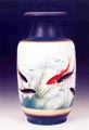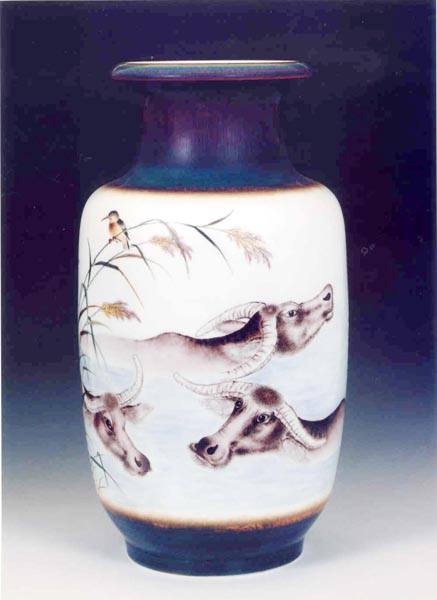 汪家旺 字禹,安徽黟县人,高级陶瓷美术师,青年陶艺家,中国工艺美术学会会员,江西省工艺美术学会会员,从事陶瓷美术工作二十余年。先后求学于瓷都名家毕渊明、熊晓峰、邓肖禹诸先生,受益非浅,后为瓷都“八虬之一,梅花大师”王鹤亭老先生之入室弟子,技艺大进,作品工写兼备,形神具佳,构图新颖,讲究章法。作品多次参加陶瓷展览,并获奖。深受港、澳、台及海外人士的喜爱并收藏。汪家旺擅绘花鸟、草虫、鱼藻、走兽,尤精画鱼,被现代陶瓷名家评价为瓷都“第三代画鱼高手”。