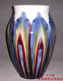 高温颜色釉装饰陶瓷,神奇新颖,其艺术感染力是耐人寻味的。经过高温烧炼后的色釉自然流动,加上窑中炉火气氛变化,有时是设计者们都预料不到的,也是变化莫测的。尤其是瓶类装饰,往往更多是需要设计者对各种色釉的发色效果及流动程度能够心中有数,从而确定施釉的厚薄与合适的部位。这种工艺性很强的设计方法大都要求把握住装饰的总体效果,不必拘泥于细小局部,同时也要运用一些半流动或不流动的色釉用以画底,进行收拾和局部刻划,使其浑然一体,既流动性好、自然,又不至于面貌全非。要搞好高温颜色釉陶瓷装饰不单是要具备一 定的艺术修养,更重要的是熟透工艺,用颜色釉装饰陶瓷才能得心应手。根据高温颜色釉制作和烧成的特性,作者更多的是运用浪漫主义的表现手法,求的是神奇之变化,一般较多运用抽象的表现,以达到丰富的想象和极大的夸张。这种顺其自然,变幻莫测,更能增强其艺术魅力,只有发挥这一优势,才能产生出偶然巧得稀世珍品来。