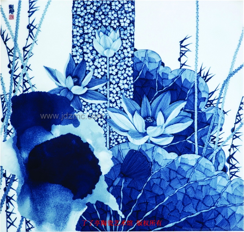 时代在不断前进,刘静的青花陶瓷装饰艺术也在与时俱进,绣球花不仅作为装饰题材的主体,也可以作为其他主体的陪衬物。她所追求的是题材形式上的变化和视觉上的感受,从其“荷花系列作品”中不难看出,刘静在实践中不停探索,蓝色绣球花也在不断更新变化着。一朵朵荷花,紧紧依偎着碧绿的荷叶,亭亭玉立,风姿绰约。有的荷花花瓣全展开了,有的含苞欲放,显得更加清秀、雅洁。这样的含笑伫立,娇羞欲语的千姿百态,预示着一片生机。而绣球花成为了背景,以衬布的形式整齐摆放,点、线、面的构图设计,将单体花瓣形象重复组织起来,连续排列使画面更加丰富饱满。同时,加入泼墨的晕染,一动、一静、一虚、一实,绣球花的装饰设计与泼墨的自然流动相辅相成,与不规则的荷花情境相呼应,传递了一团和气。