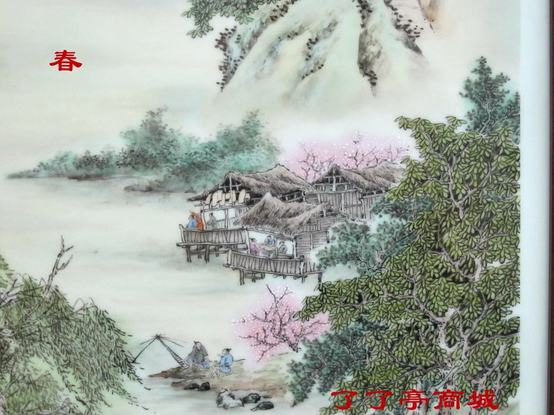 方华明幼时就喜爱艺术,八十年代开始师从程元漳学习陶瓷彩绘,师承了程元漳优美精细的画风。这幅山水作品,画作清新雅致,有浪漫磅礴之气。颇耐近看远赏,观之如入仙境超然脱俗,山里人家、群山峻林、无论巨细.均表演得淋漓尽致。我把此作挂在我景德镇门点进门处。凡进入店者,都会满有兴趣地观赏一阵,然后发出共同的感概:"真细!不容易!好作品。" 此作颇费功夫,画中的工笔人物是慢功出细活,它宛若是少女手中的女红,纤针细线,微孔密眼,又如力士手中的刀斧,左右开弓,几经打磨,刻画出山峻岭美。