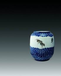 | 备 注: | 作品赏析 青花在卢伟的创作中占有非常重要的地位,此件作品也不能例外。作品用大量的叶形纹饰装饰器物的口部、肩部及腹下,层层垒叠,鳞次栉比,青花发色浓艳凝重,与画面中间的大片留白形成鲜明对比,可谓“疏可走马,密不透风”。器身留白处以工笔绘水鸟若干,精工细丽,设色典雅,造型古拙,似脱臼於宋代院体花鸟画风。整件作品清新脱俗,意境隽永。 作者简介 卢伟(B.1967),江苏宜兴人,现就职於景德镇市陶瓷研究所。系中国古陶瓷学会会员、中国工艺美术会会员。1998年成立景德镇市陶瓷研究所卢伟陶艺工作室。 | ||